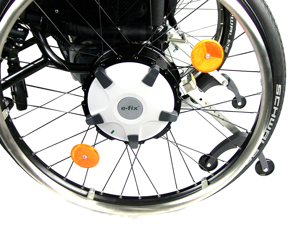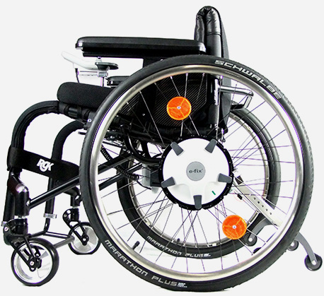 Cover long distances quickly and easily in the comfort of your lightweight made to measure RGK wheelchair. The hi-tech hand control unit provides full power and direction control and 'on-the-spot’ rotation. With compact components that are quick to release, the e-fix can be transported without difficulty and manual wheels can be fitted at your convenience.
